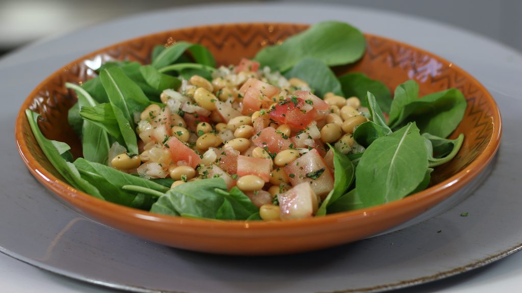 Em um prato, coloque as folhas e por cima adicione a soja ao vinagrete e sirva em seguida.